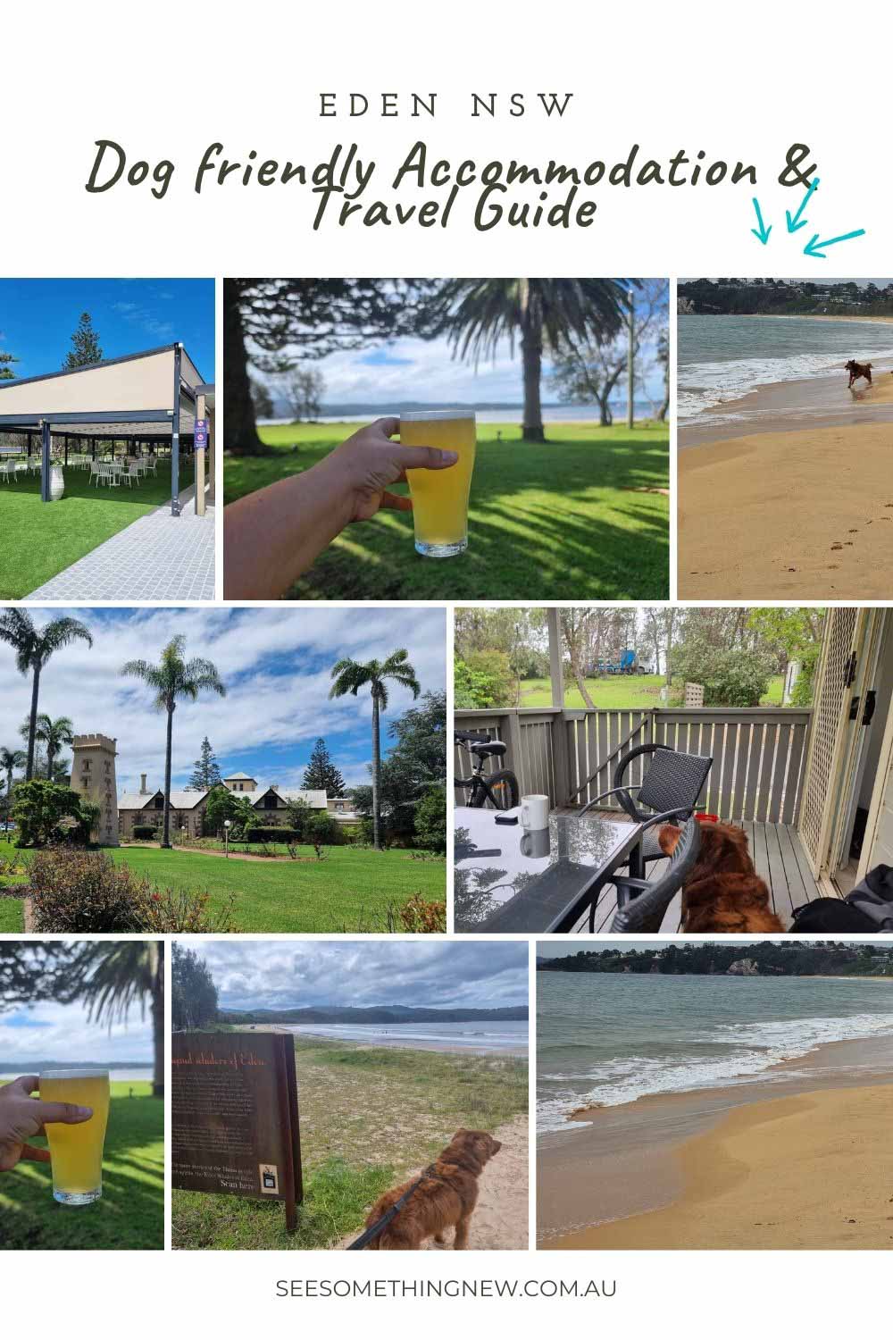The Seahorse Inn Hotel & Villas (booking.com) is a 10-minute drive south of Eden and has pet friendly villa accommodation. It's a beautiful absolute beachfront property (and the beach is dog-friendly on leash) with a dog-friendly restaurant/bar with beach views (beer garden type tables on the lawn or the paved patio section).