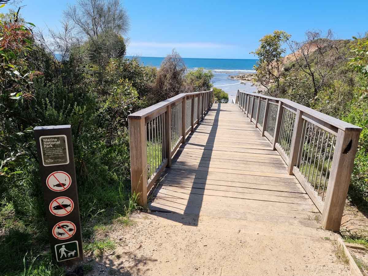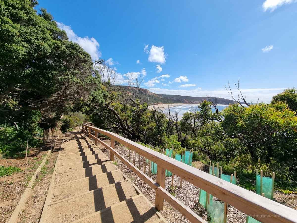 The first lot of steps to Point Addis on lead dog beach Signage showing this beach is dog friendly on lead
