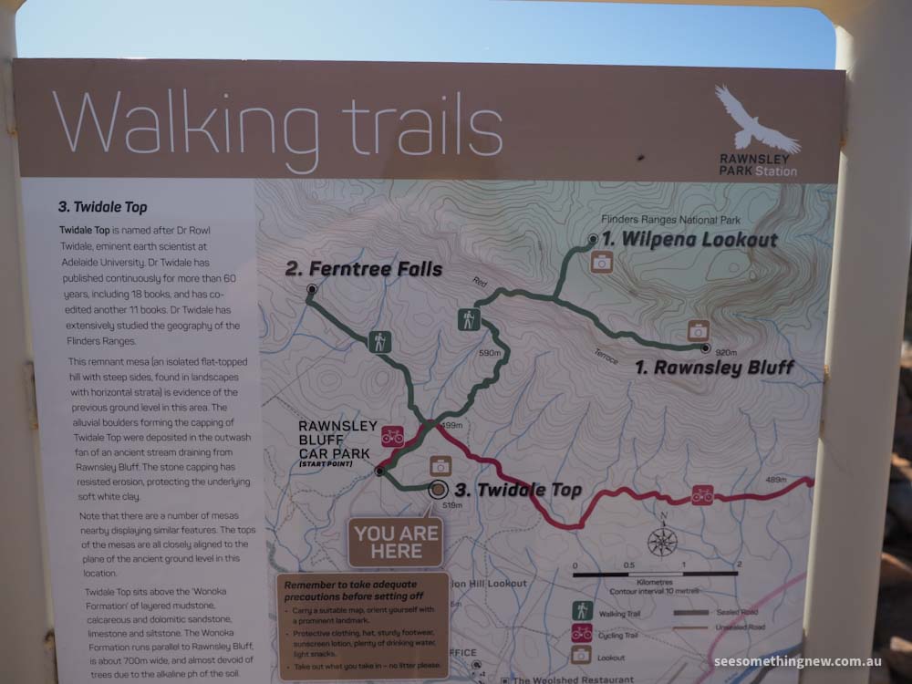 The Rawnsley Park Station turn off is signposted from Flinders Ranges Way. You follow the Rawnsley entrance road for a few km, past the station hill lookout (sign posted just with a camera symbol sign) and take the turnoff to 'Rawnsley Bluff' (as the Twidale Walk leaves from the same carpark as the Bluff walk), marked as 'Rawnsley Bluff Car Park' on google maps.